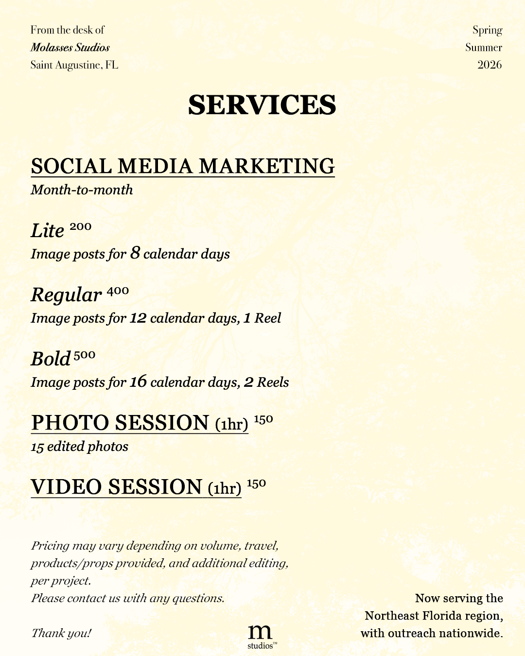 Photography, videography, marketing, branding, design & more.